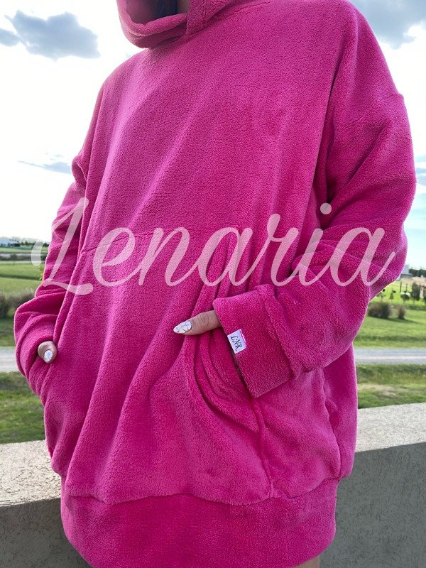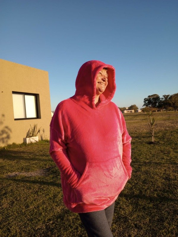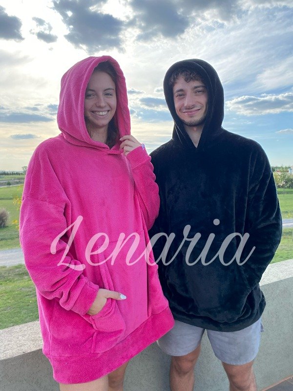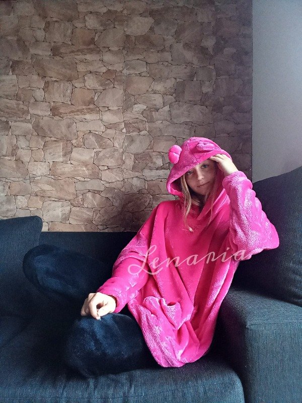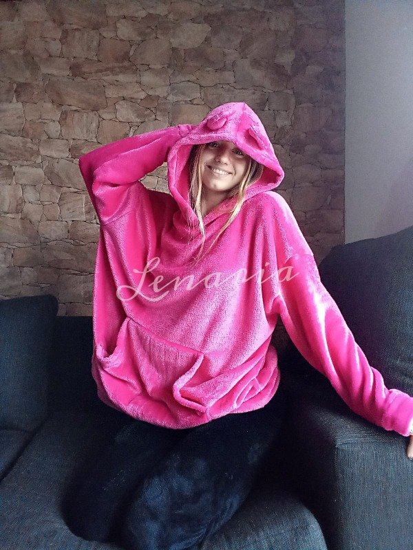 Con bolsillo canguro y capucha con o sin orejas. Mide aprox 130cm de contorno y 78 cm largo.