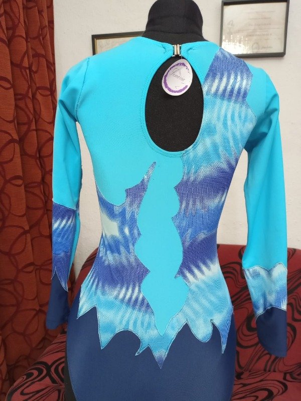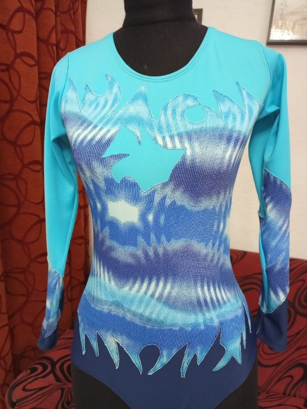 Malla de lycra de primera calidad, con bordado abstracto en tonos de azul y estampado. Manga larga,sin pollerin, con el pecho forrado y gota en la espalda.