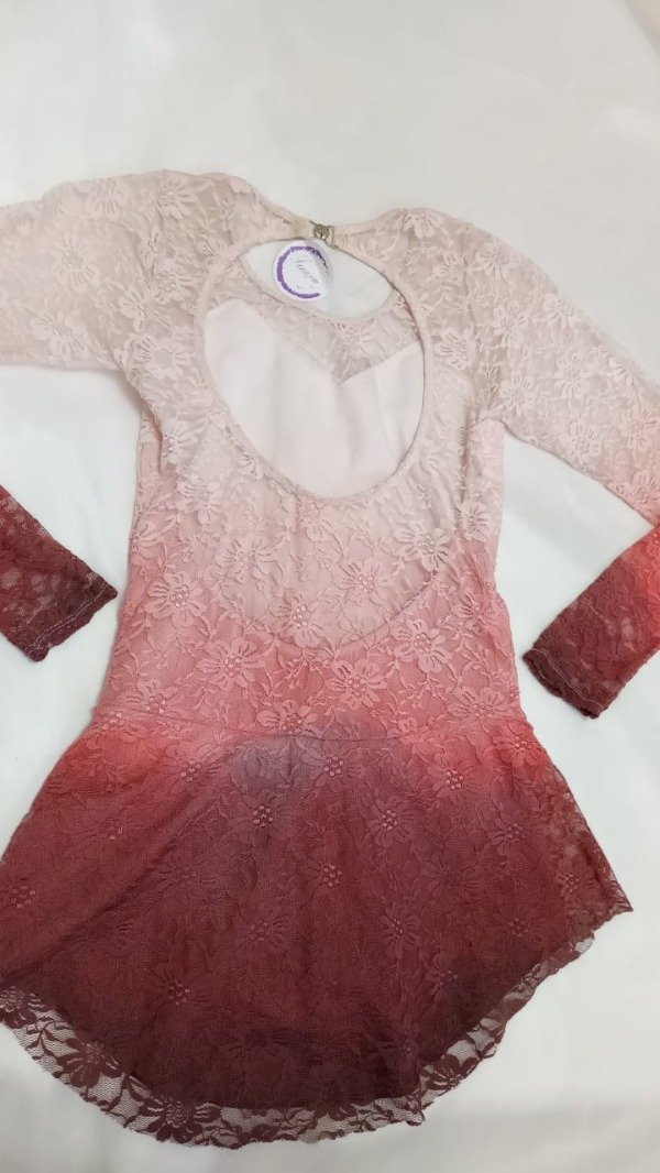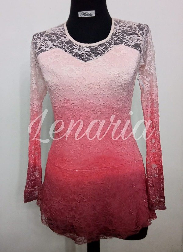 Malla con lycra y encaje, en degrade de color rosa. Col pollerin y mangas largas. Pecho forrado con espacio para push up