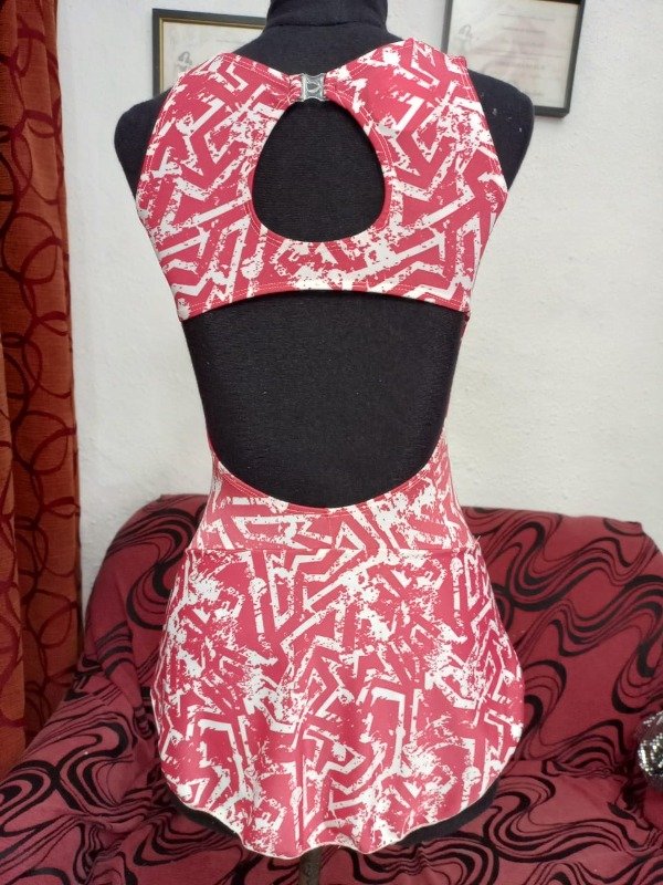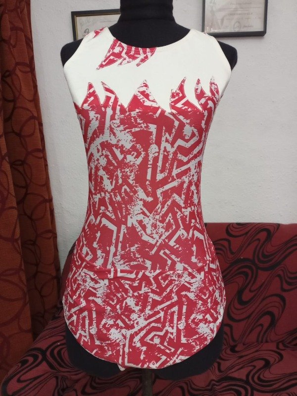 Malla de lycra estampada con bordado en blanco, con pollerin y el pecho forrado.